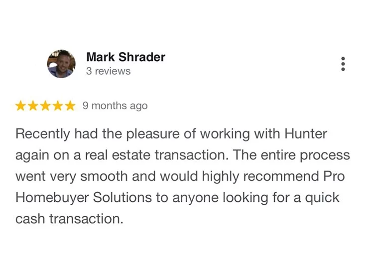 “A few months ago I found myself in a bad place where I had to liquidate everything. I was introduced to Hunter from a friend of mine, and he made the whole process of selling my house fast and convenient. He was extremely polite, knowledgeable, and very patient with me. He walked me thru everything before it happened. He made a situation that was difficult and easy to deal with it. Thank you and God bless.“